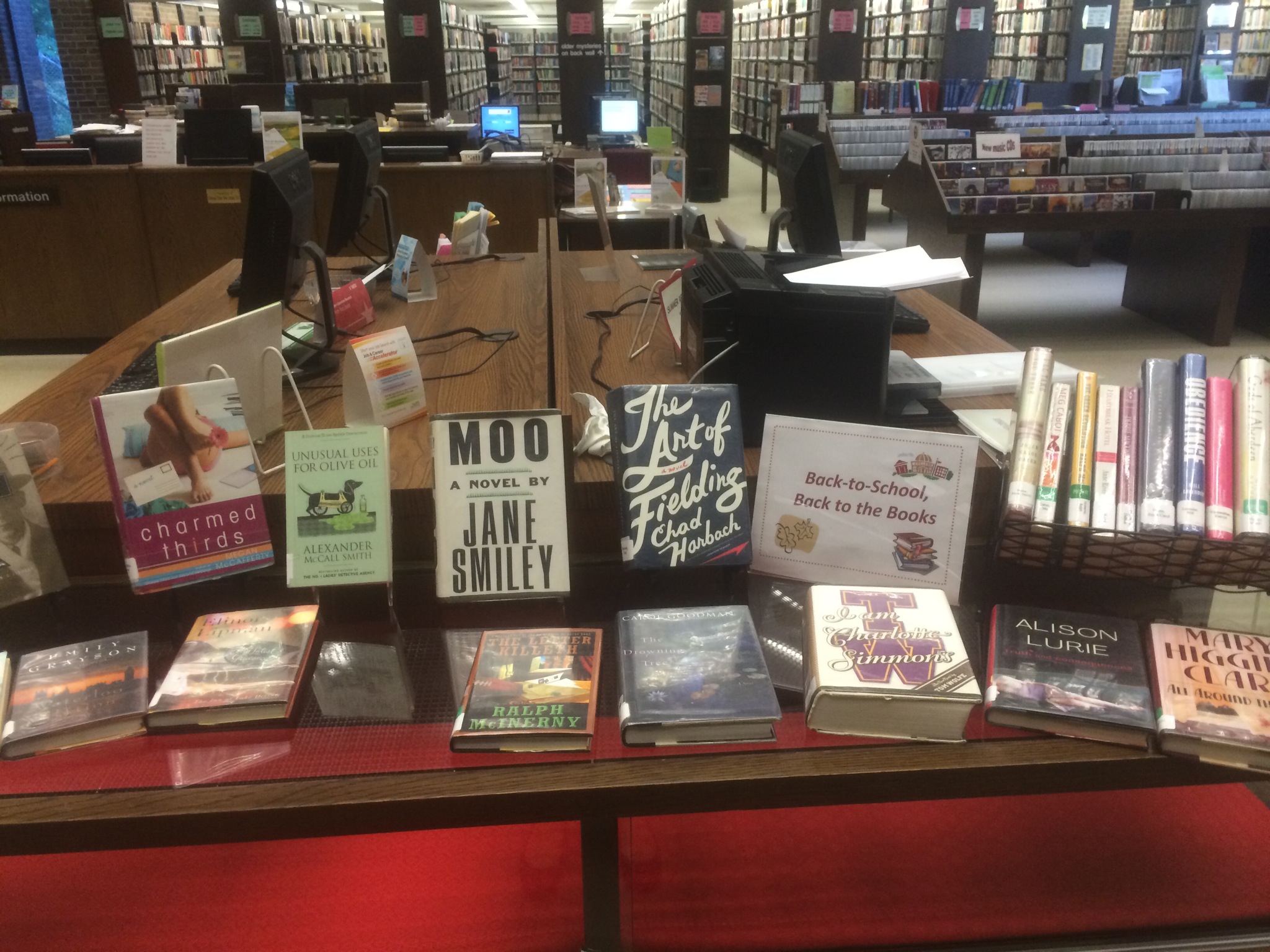 Quick book display at the New Library. My supervisor came up with the theme and together we pulled the back-to-school, college-themed books. I made the little sign.